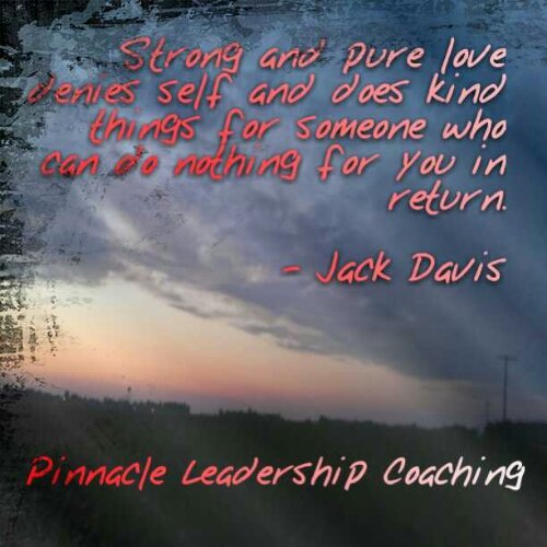 Strong and pure love denies self and does kind things for someone who can do nothing for you in return. ~Jack Davis Share this: Click to share on X (Opens in new window) X Click to share on Facebook (Opens in new window) Facebook More Click to email a link to a friend (Opens in new window) Email Click to share on LinkedIn (Opens in new window) LinkedIn Click to share on Reddit (Opens in new window) Reddit Click to share on Tumblr (Opens in new window) Tumblr Like Loading...